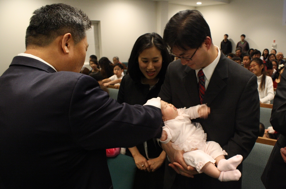 믿음의 부모님들의 품에 안겨 유아세례 받는 모습입니다.